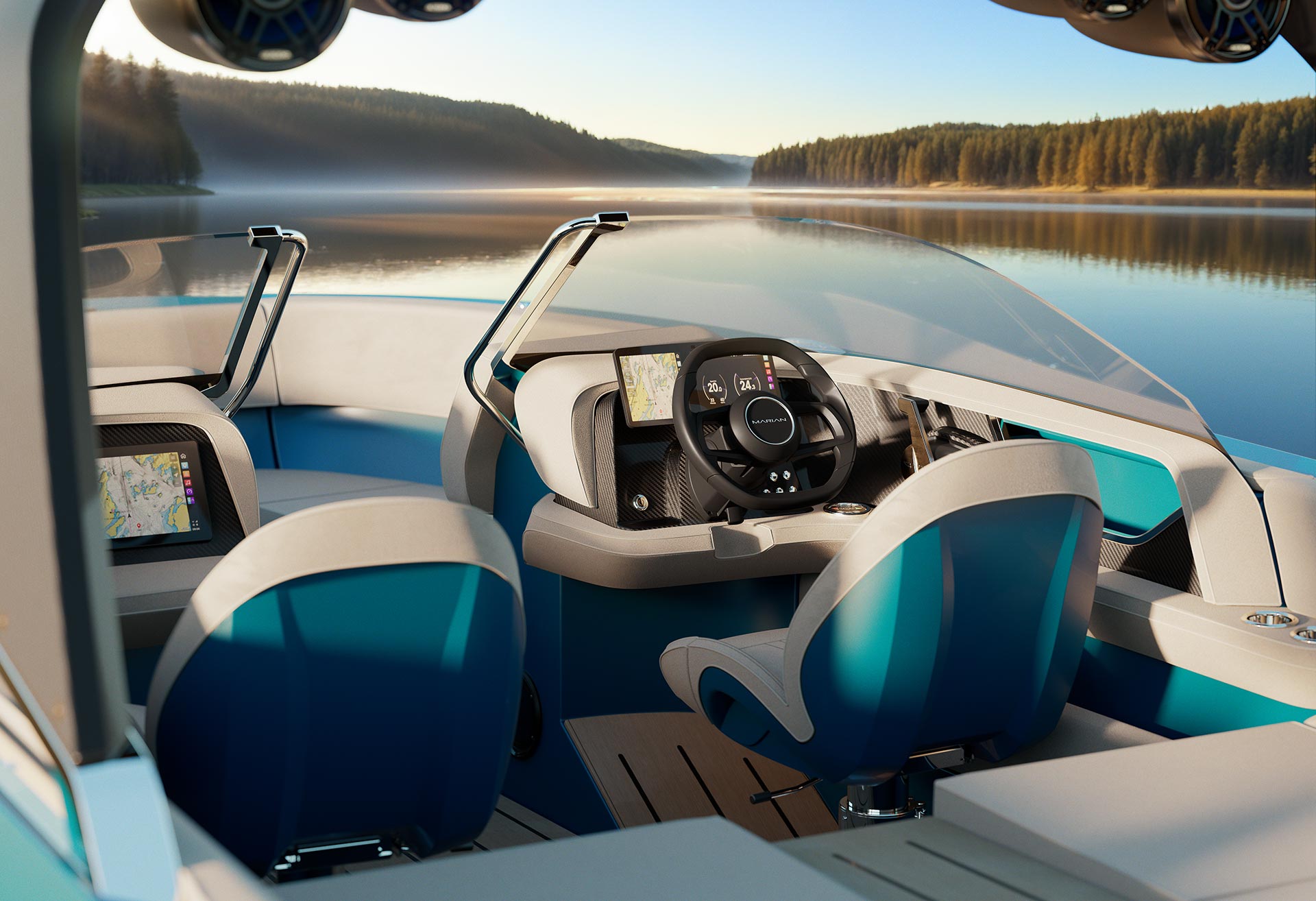 Das digitale Cockpit mit großzügigem Touchscreen vereint sämtliche Funktionen in einem klar strukturierten Interface. Leistung, Surfsteuerung, Licht und Musik – alles auf einen Blick, intuitiv steuerbar und jederzeit unter Kontrolle.